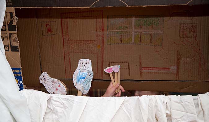 Set the cardboard box theatre on a table, bench, or two chairs in such a way that children can move behind it to perform their show.
