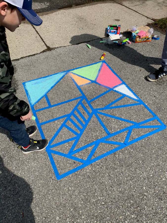 There are a lot of variations you can try with this activity. Write a positive message next to your mosaic – or spell out a message as a mosaic by taping off the letters and filling them in with chalk! Children can try the same spelling approach by taping off the letters of their names and filling them in.