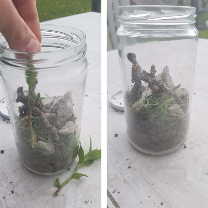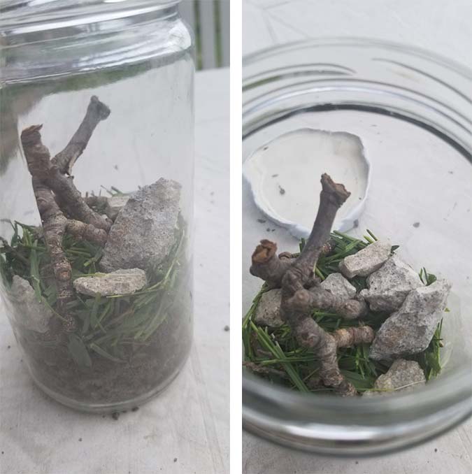 Tip: You can start by placing rocks at the bottom of the jar, and then adding a layer of soil and finally the leaves/twigs/moss etc. for a more “traditional” look, however, there is no wrong method! Use your imagination and come up with a unique design!