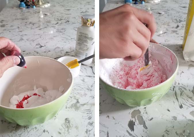 Add 1/2 cup of lotion and 1-2 drops of food colouring to a bowl and mix until combined.