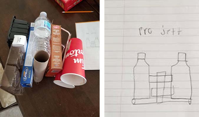 Encourage your child to draw their invention first. Making a plan is a great organizational skill and prompts children to consider a variety of things before beginning a project. Have them determine what function(s) they would like it to be able to do once completed. It’s okay to keep it simple!