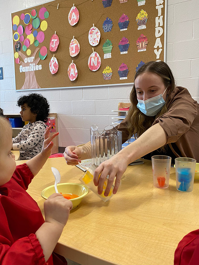 A student on placement engages a toddler at a PLASP Centre.