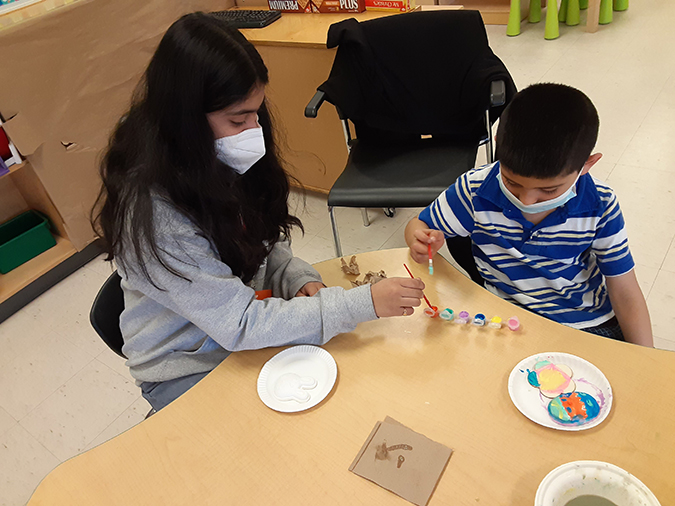 A volunteer and child paint together during PLASP’s after school program.