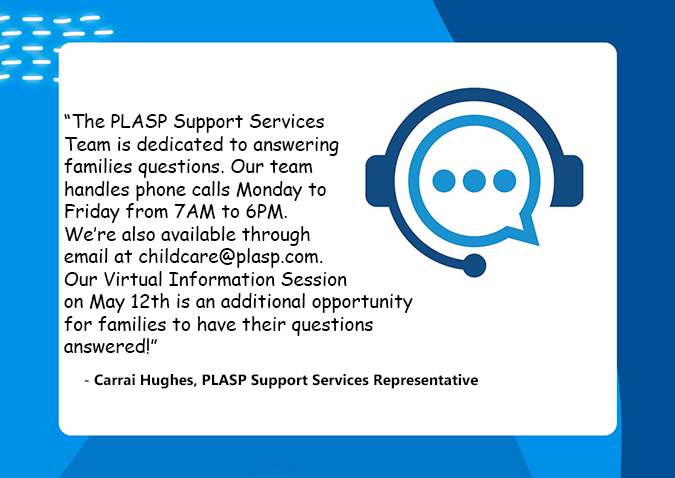 PLASP Child Care Services is hosting a virtual parent information session on Thursday, May 12th at 7pm. Whether you’ve already registered, or are thinking of registering your child for September, PLASP wants to ensure that parents have an opportunity to hear more about our programs and have their questions answered.