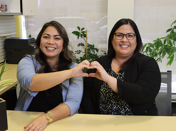 Diane Phu, Manager of Program Services and Candace Ferriss, Human Resources Manager, share the “Inspire Inclusion” pose.